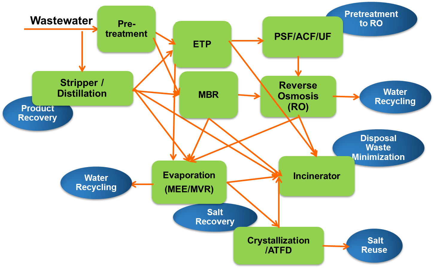 • Separation by evaporation or boiling of water part of waste water not reusable, in evaporators, crystallizers and condensate recovery. ZLD plants produce solid waste